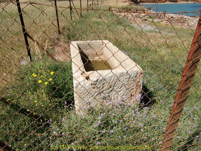 Überall Grundmauern und Säulenreste, Tonscherben Rechts: Wahrscheinlich eine Badewanne. Unter dem Schotter und Gras befindet sich abgedeckt ein Mosaikfußboden