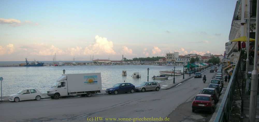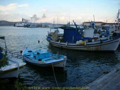 Blick über den Fischerhafen zum Fähranleger Andenkenladen alles was das Herz begehrt