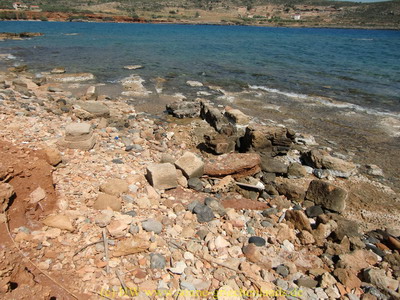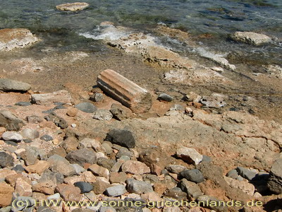 Überall Grundmauern und Säulenreste, Tonscherben Rechts: Wahrscheinlich eine Badewanne. Unter dem Schotter und Gras befindet sich abgedeckt ein Mosaikfußboden