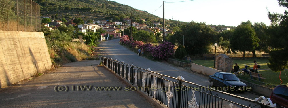Der Bick Richtung Dorfmitte von der Kirche. Rechts der Festplatz mit dem Brunnen